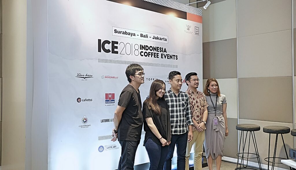 (ki-ka) Yudhistira Bawono selaku Ketua Pelaksana Indonesia Coffee Events 2018, Yoshua Tanu selaku Ketua Barista Guild Indonesia, dan Ratu Tria selaku Assistent Marketing Communication Manager ARTotel Thamrin, Jakarta, sebagai salah satu sponsor ICE 2018.